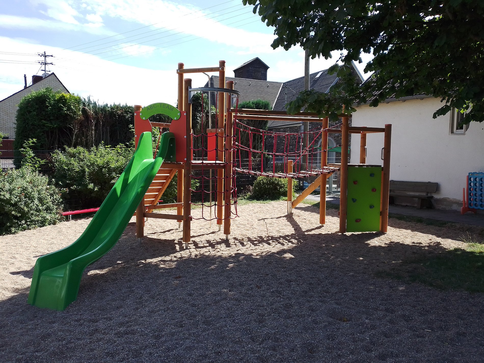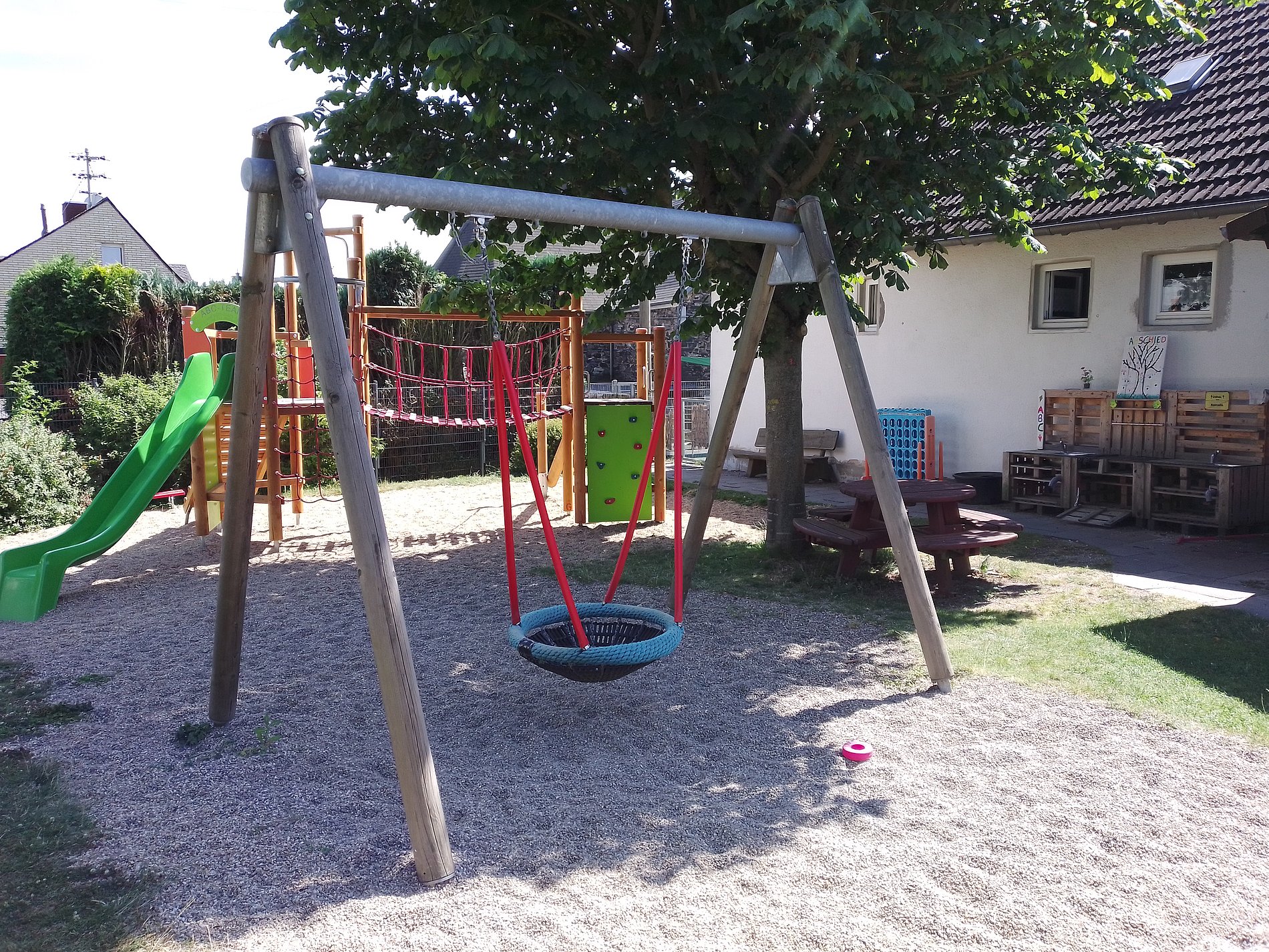 Unsere Einrichtung verfügt über ein großzügiges Außengelände und ist mit einem Sandkasten, einer Kletter- und Rutschkombination mit Hängebrücke, einer Nestschaukel sowie einem Klettergerüst und einer Wippe ausgestattet.