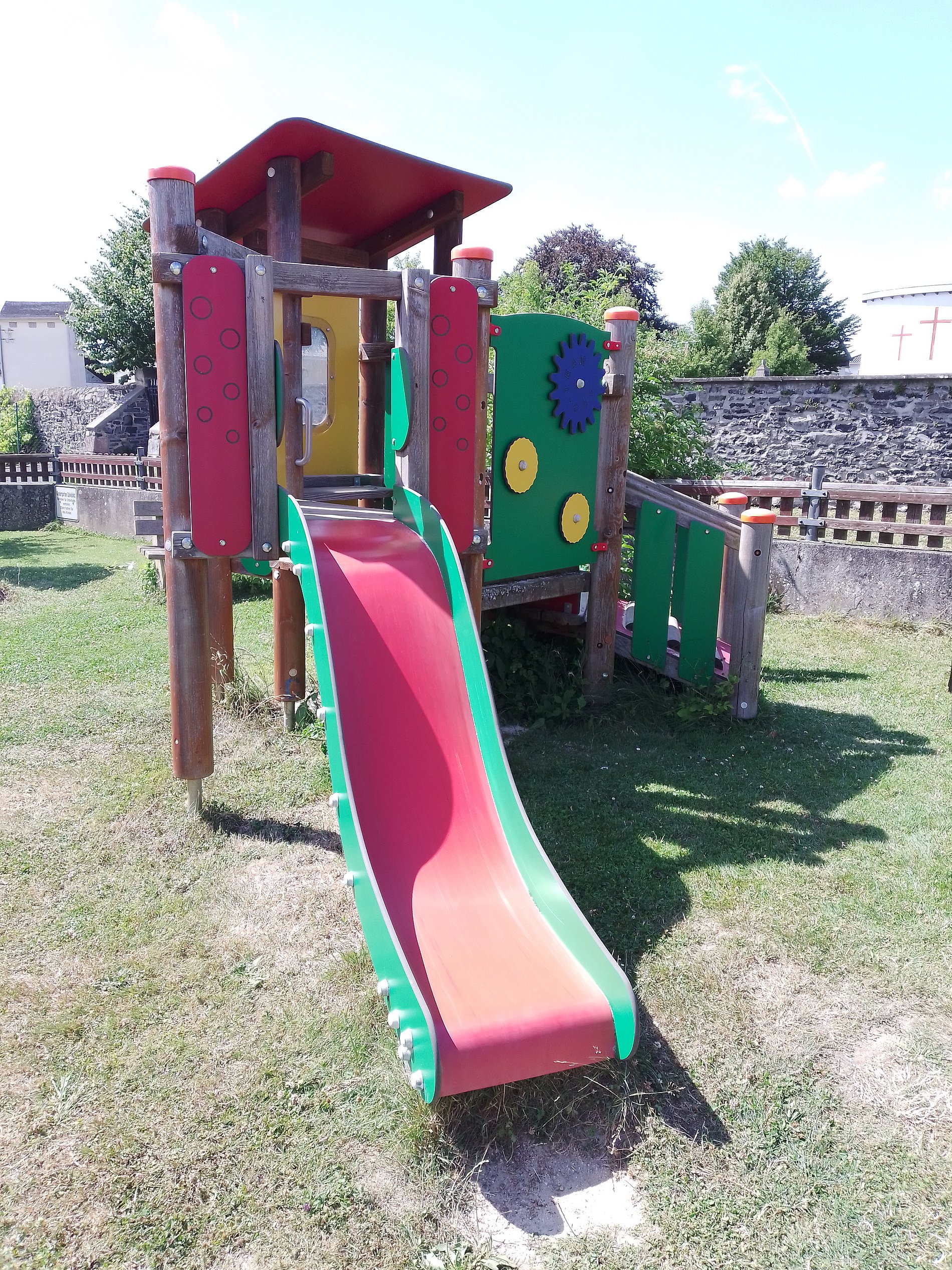 Für unsere Kleinen befindet sich im oberen Teil unserer Gartenanlage eine Kletter- und Rutschkombination, die speziell unsere U-3 Kinder dazu einlädt erste Erfahrungen im Bereich Klettern und Rutschen zu sammeln.