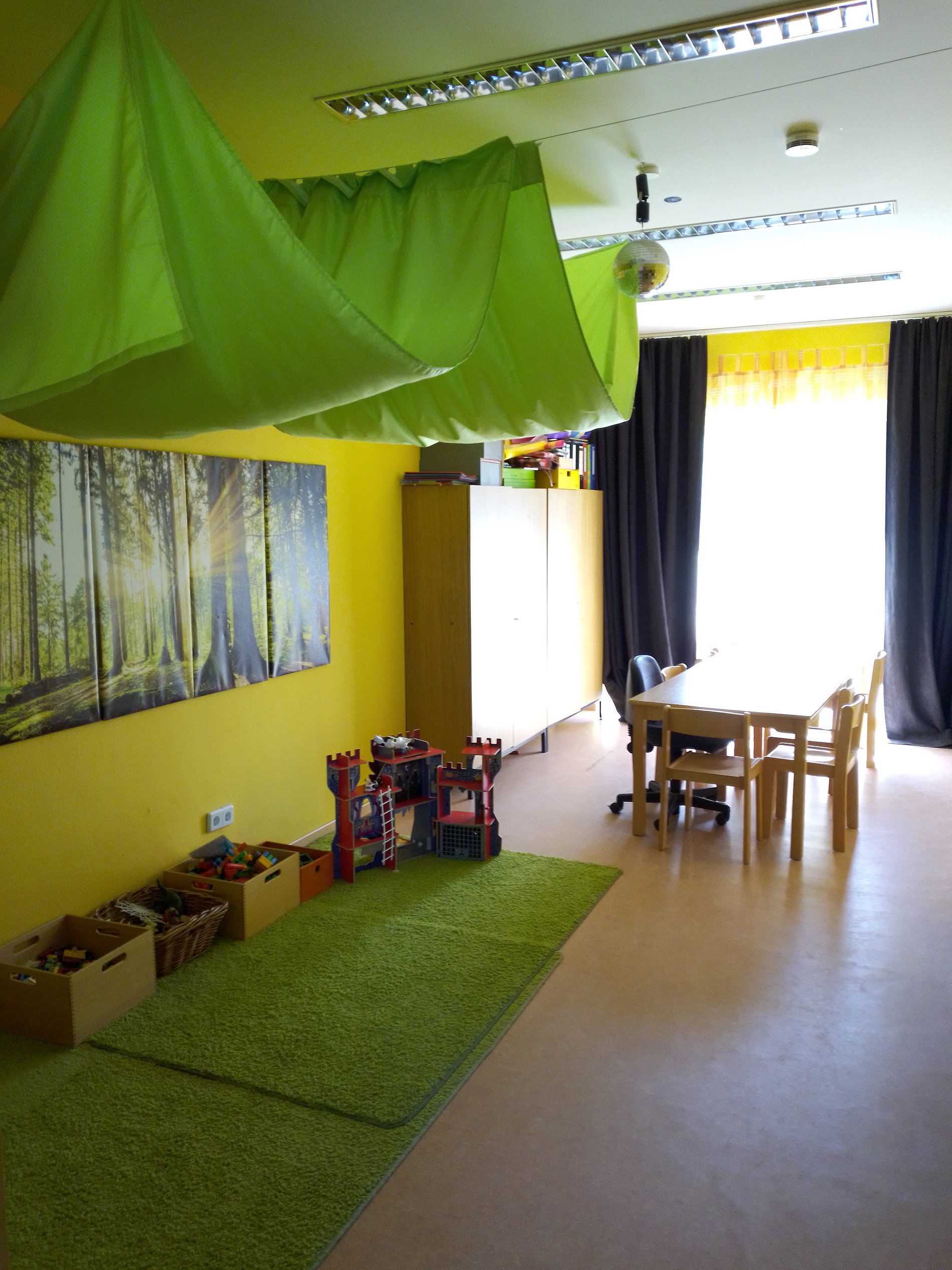 Unser Gebäude ist sehr hell und großzügig gehalten und besitzt einen Projektraum, der für Stillbeschäftigungen, Vorschularbeit und Kleingruppenangebote genutzt wird.