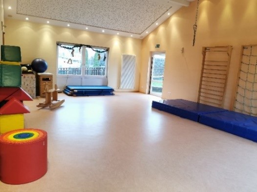 Der große Bewegungsraum wird für angeleitete Turnangebote, Feste und Feiern und gruppenübergreifende pädagogische Angebote genutzt. Außerdem steht dieser Raum den Kindern beider Gruppen während des Kitatages zur freien Verfügung. Sie haben die Möglichkeit sich mit Kindern ihrer Wahl zu verabreden und selbst zu entscheiden, was sie mit den verschiedensten Bewegungsmaterialien, wie Klettergerüste, Balancierpfade, Softbausteine u.v.m., spielen möchten.